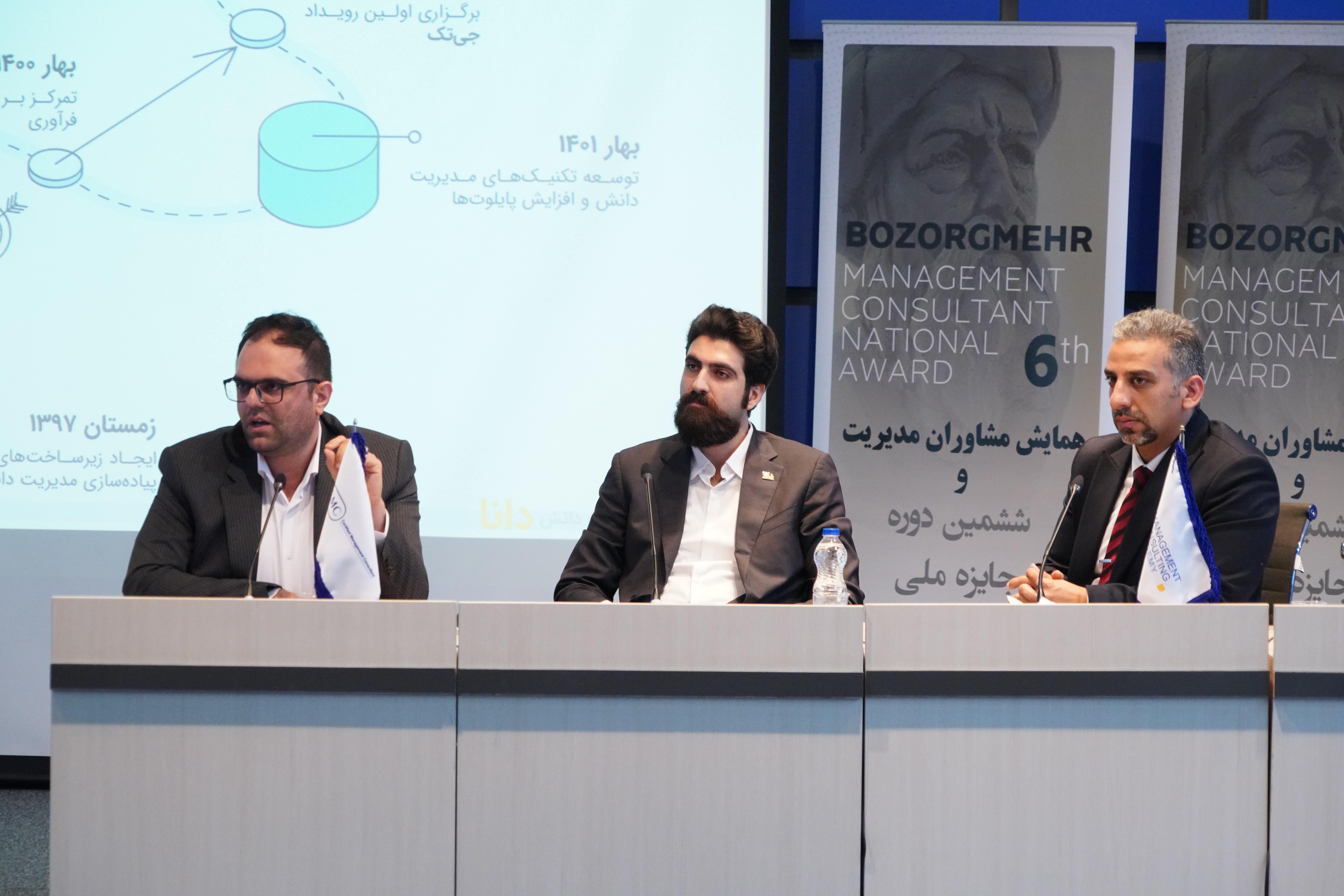 در بخش اول پنل، رتبه یک آقایان مهندس احمد سپهری(مشاور پروژه) و مهندس ساسان رستمنژاد(مدیرعامل گروه مدیریت دانش دانا) به ارائهی پروژه خود پرداختند.